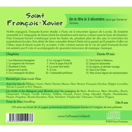 Noble espagnol, François-Xavier étudie à Paris où il rencontre Ignace de Loyola. Ils fondent ensemble la Compagnie de Jésus (dont les membres sont mieux connus sous le nom de Jésuites). Puis François-Xavier s'embarque pour les Indes où, pendant plus de dix ans, il convertira les populations locales. Son désir de faire connaître Jésus-Christ est si grand qu'il projette d'aller en Chine, mais il meurt avant d'y accoster. Cette version sonore de la vie de saint François-Xavier est animée par 8 voix et accompagnée de près de quarante morceaux de musique classique.